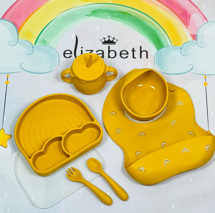 ۷ تکه (بشقاب تقسیمبندی ساکشندار، کاسه، قاشق و چنگال سیلیکونی، لیوان آبخوری نیدار و سرسیلیکونی، پیشبند)