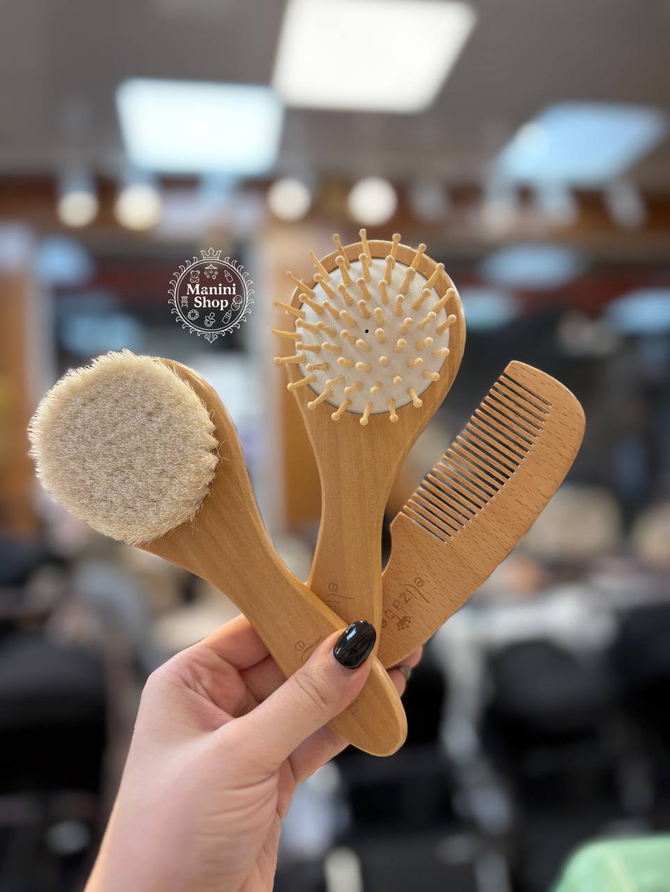 3 تکه چوبی با الیاف طبیعی برای شانه زدن مو و ماساژ ، ضدحساسیت و hypoallergenic، قابل شستشو، فاقد مواد شیمیایی مضر، مناسب موهای نرم نوزاد ، دسته ارگونومیک