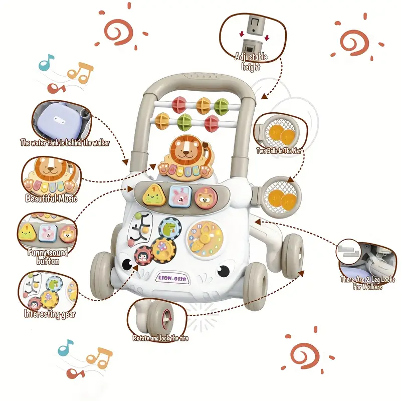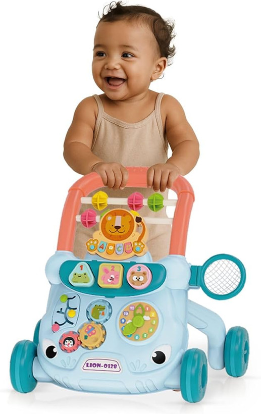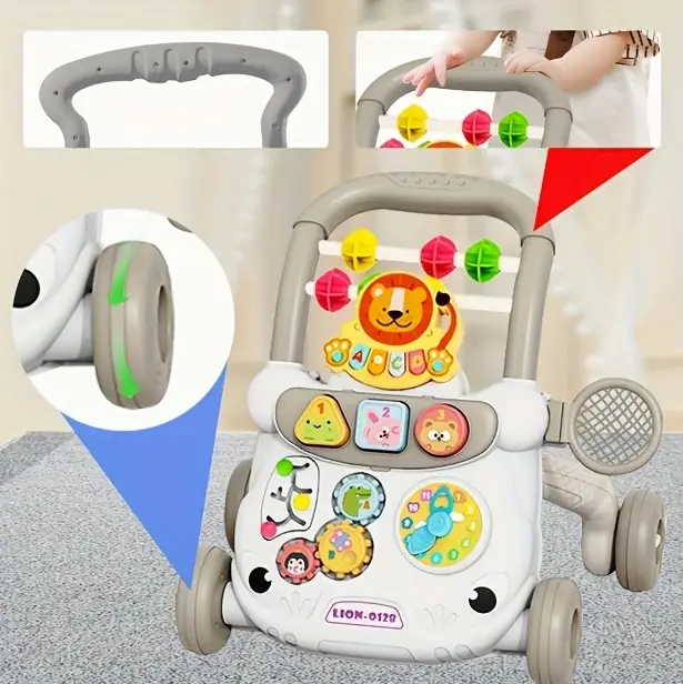 واکر آموزشی موزیکال مدل happy growth برند Midule دارای اسباببازیهای رنگی رنگی بسیار جذابی است. ابعاد آن در حالت بستهبندی 34*12*37 سانتیمتر و بعد از نصب 39*33*41 سانتیمتر است. 3 عدد باتری قلمی 1.5 ولتی جهت شنیدن موزیک دکمههای آن و پخش نور نیاز است. دستهاش در دو حالت تنظیم شده و لاستیک آن دارای نوار لاستیکی است. کلیدهای آن صدای حیوانات و موسیقی پخش میکنند. دارای یک ساعت با دستههای متحرک است. کودک بالای 6 ماه به صورت نشسته هم میتواند با آن بازی کرده و سرگرم شود. قابل استفاده برای هر دو جنسیت دختر و پسر است.