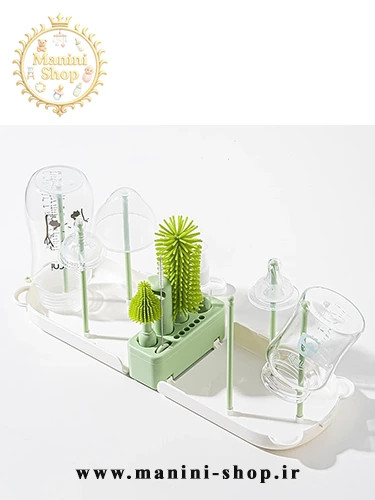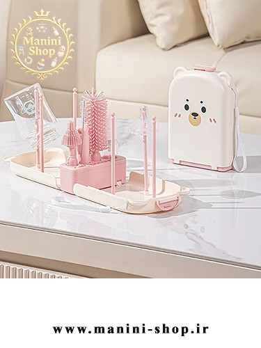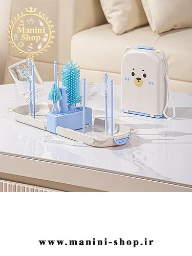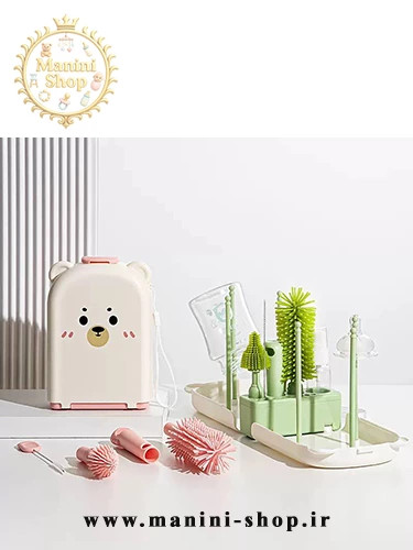 جنس برسهای ست شیشهشور سیلیکونی آبچکان دار پرتابلی طرح خرس ازسیلیکون نرم، منعطف و بسیار با کیفیتی است. این مجموعه هر آنچه که شما برای شستن شیشه شیر نوزاد خود نیاز داشته باشید را در خود دارد. دارای 3 برس مختلف، ظرف اسپری مایع استریل، استند آبچکان و باکس حمل طرح خرس است. با وجود این باکس حمل قفل دار همه وسایل کاملا تمیز و مرتب داخل آن جای گرفته و گم نمیشوند. از برس کوچک آن جهت شستشوی سر شیشه استفاده میگردد. با وجود اسپری مایع استریل کننده، شما قادر خواهید بود که شیشه و لوازم تغذیه نوزاد را با دقت ضد عفونی کنید. برس نیشور آن دارای شکل باریک و خاصی است. با آن میتوانید نیهای شیشه شیر نوزاد و کودک را کاملا تمیز کرده و بشویید. با وجود استندهای داخل باکس میتوان شیشه و سر شیشه را به طور مجزا روی آن قرار دهید تا خشک شده و به راحتی در دسترس باشند.